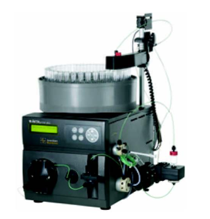 AKTA蛋白层析工作站能做出不同盐浓度的缓冲液,进行多样品分析及工艺探索,配合电磁阀和分部收集器作活性组份收集。在线同时检测pH、电导及三种280nm的吸收波长。可以进行各类蛋白质、核酸和天然产物分离纯化。