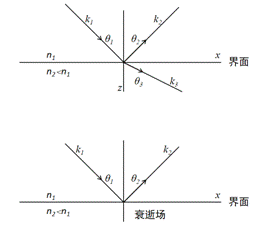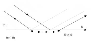 全反射时如图中所示沿X轴方向振幅衰减的一个波,即入射光波在反射面不立即消失,而是投射进入光疏介质一定深度,且振幅在垂直方向呈指数衰减,这种电磁波叫消失波。