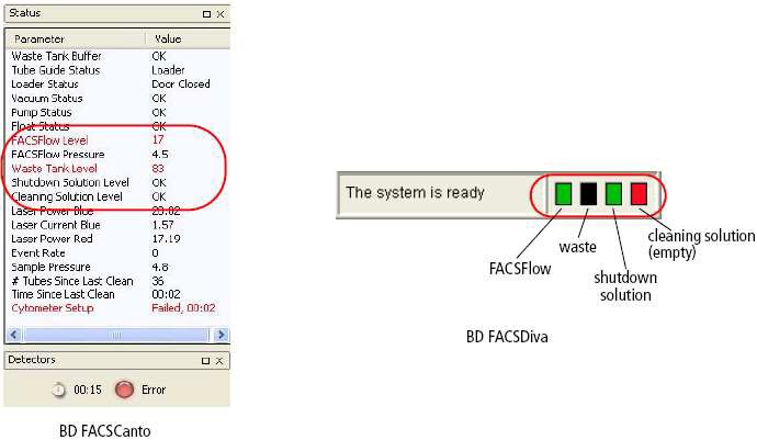 6、 在“仪器框”中查看液面水平,过低液面和已满废液显示红色。