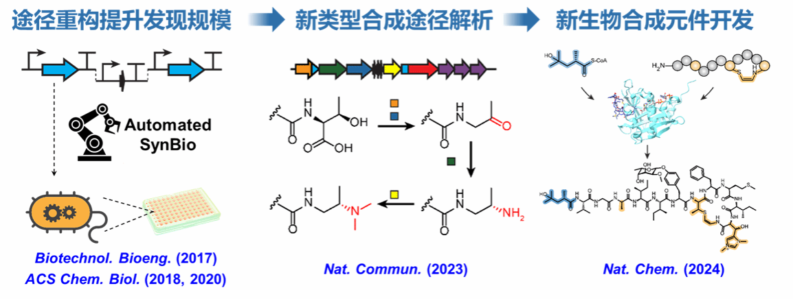 课题组综合生物信息学和合成生物学前沿技术,结合高通量载体构建及筛选策略,致力于大规模开发利用自然界中未知功能的多肽分子及相关生物合成元件,实现多肽结构和功能的创新,优化多肽分子合成途径,构建多肽细胞工厂,促进其在医药健康、农业食品、生物材料等方向的应用。