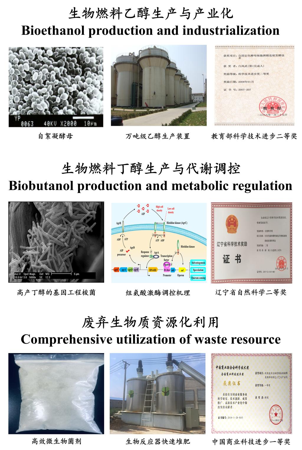 团队主持或参与国家基金委、教育部、省市及企事业项目近30项,包括国家自然科学基金面上项目2项,青年项目3项,在Nano Letters、Journal of Membrane Science, Biotechnology and Bioengineering、Biotechnology for Biofuels和Biotechnology Advances等国际期刊发表SCI论文80余篇,累计他引1000余次。以第一发明人授权中国发明专利7项,申请PCT国际专利1项。重要研究成果中,“可再生液体燃料绿色生物炼制的基础及调控理论”获得2017年辽宁省自然科学二等奖,“先进生物能源丁醇的生物制造”获得2014年辽宁省自然科学成果一等奖,“利用废弃物生物质制备短链醇类燃料的绿色工艺与产业化”获得2018年中国商业联合会科学技术进步一等奖。
