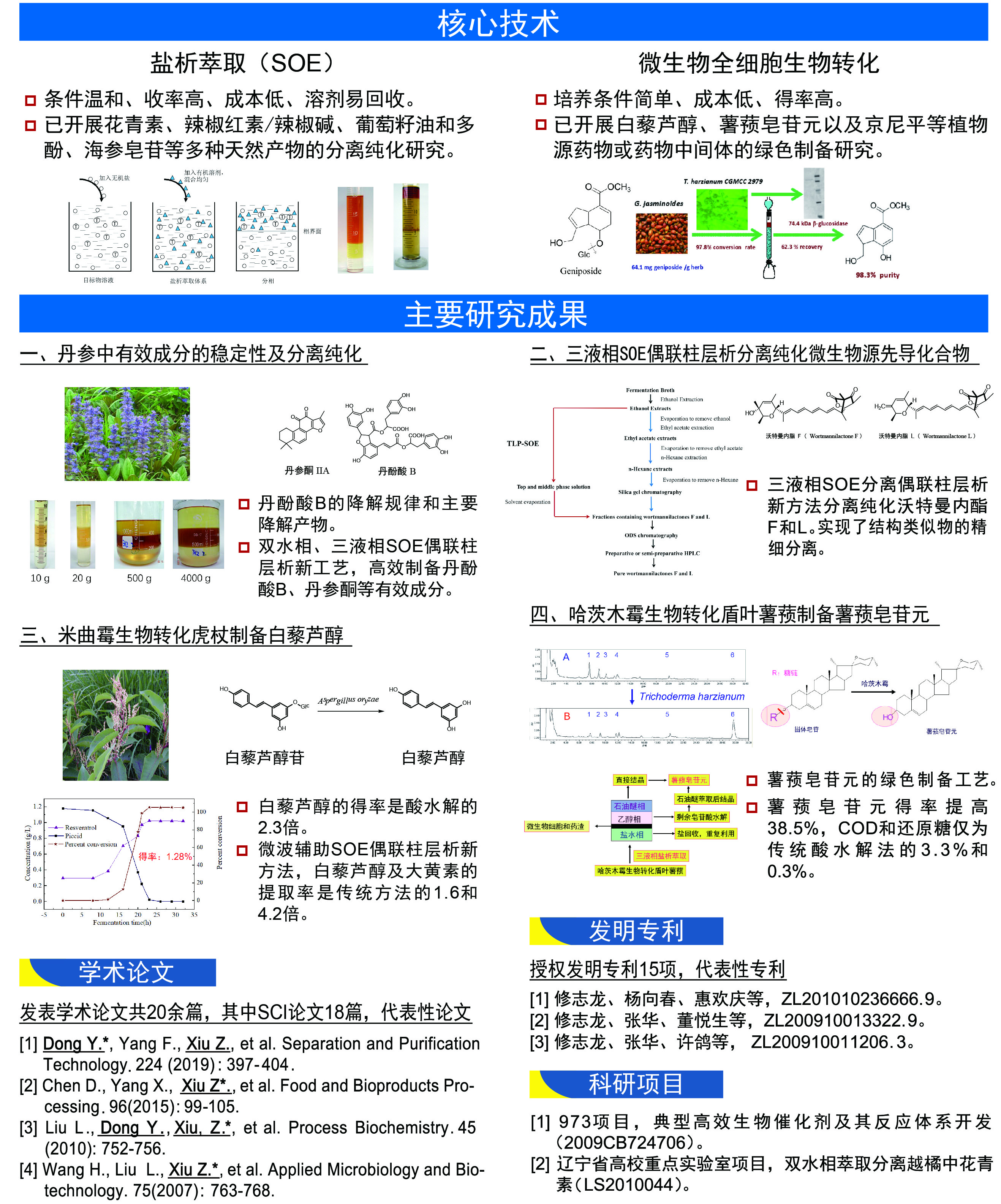 主要研究方向包括:生物质能源和生物基化学品、海洋活性物质的分离与活性研究、蛋白类的分离与修饰耦合集成技术、天然产物的生物转化与分离、天然产物防治糖尿病及其作用机制、微生物来源的先导化合物发现等。先后完成国家自然科学基金、国家重点科技攻关项目、国家863项目、973子课题、教育部新世纪优秀人才支持计划和企业委托工程技术开发等40余项课题,在国内外学术期刊上发表论文462篇,已授权中国专利61项,美国专利1项,主编、参编、主译教材、专著16部,获辽宁省技术发明二等奖1项、自然科学三等奖2项。