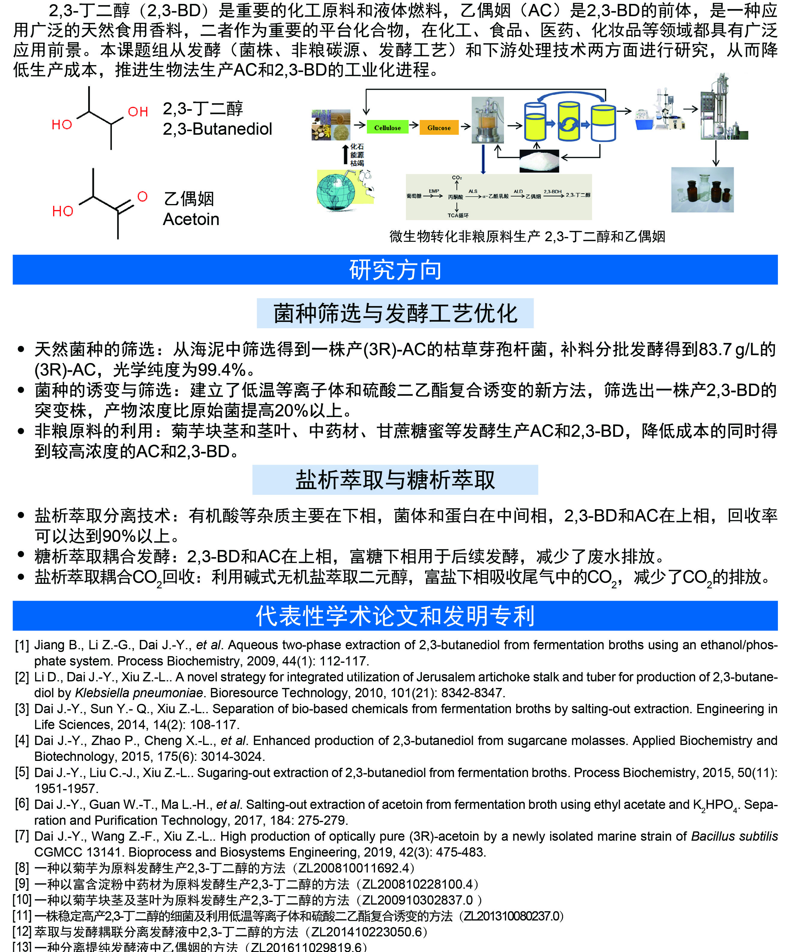 “生物转化与生物分离”课题组现有师生四十多人,其中教授1人,副教授3人。研究工作主要集中于生物催化转化和高效分离技术,重点是利用代谢工程和系统生物学手段进行工业微生物的选育、发酵与分离过程的集成优化等,产品包括1,3-丙二醇、乳酸、2,3-丁二醇、微生物次生代谢产物、天然和海洋活性物质等。
