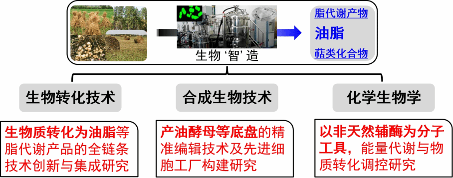 本团队致力于生物转化技术、合成生物技术和化员工物学研究,目标是形成生物质资源转化为液体生物燃料和化学品的原创性、前瞻性技术,并揭示相应转化过程的分子机制。更具体地,研究1)生物质转化为油脂等脂代谢产品的全链条技术创新与集成、2)产油酵母等底盘的精准编辑技术及先进细胞工厂构建、3)以非天然辅酶为分子工具,能量代谢与物质转化调控。